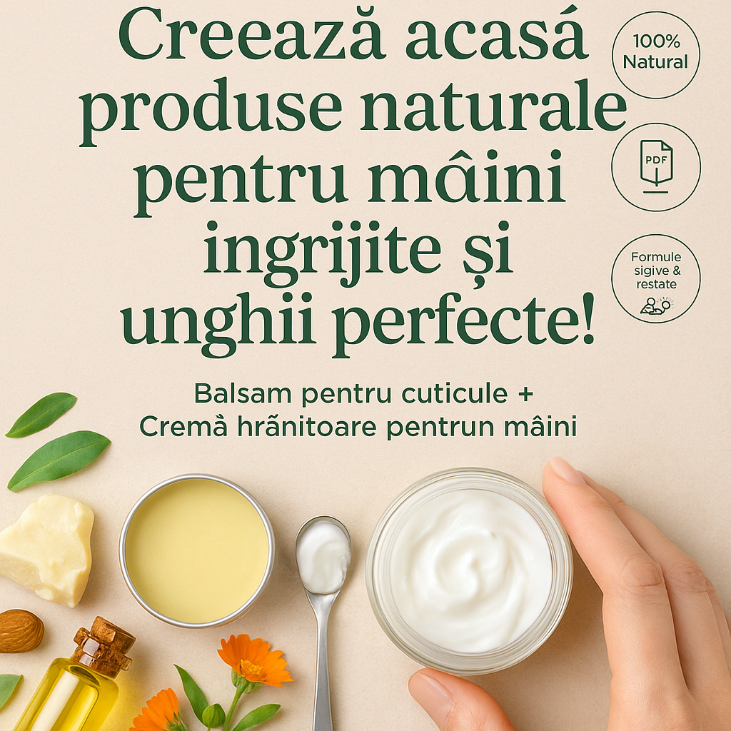 Acest Ghid PDF te învață să creezi două produse esențiale pentru îngrijirea zilnică a mâinilor – 100% naturale, eficiente și potrivite chiar și pentru pielea sensibilă.